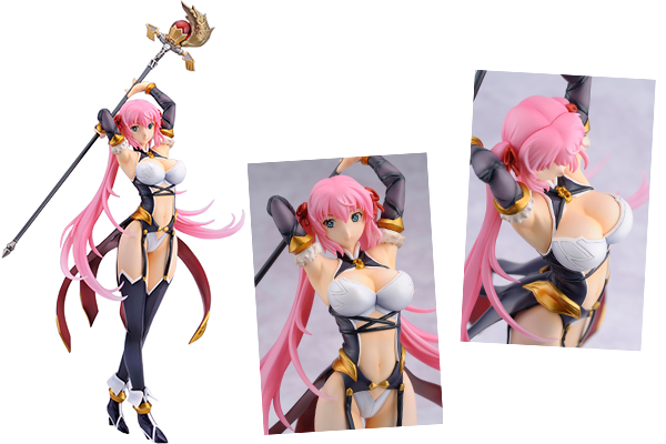 風に舞うツインテールや伸びやかな肢体といったボディライン以外にも、こぼれんばかりの胸や脇の下など、見どころの多いフィギュアです。たなびくピンク 色の髪の毛はクリアパーツで成型され、淡く輝く質感を再現。武器である聖錫や服の飾りもフィギュアならではの作り込みと彩色で仕上げられています。