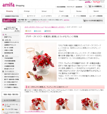 アミファはプリザーブドフラワー花材のショッピングサイトであると共に、花文化に関連した情報ページを多く掲載しているサイトである。今回の特集ではプリザーブドフラワーを使用したリッチなアレンジにフォーカスし、関連するアレンジ・花材を紹介している。合わせて、花材が高価なためリッチなアレンジが難しいとされるプリザーブドフラワーアレンジを、小物使いでリッチに見せるテクニックも紹介している。
