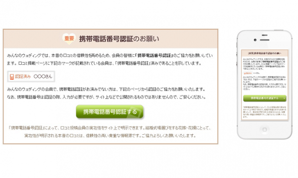 花嫁花婿が、「みんなのウェディング」を通じて式場選びをする際に参考にする、本音の口コミの信頼性を向上させることを目的に、各口コミ関連サービスで導入実績のある「携帯電話番号」を利用した認証システムをみんなのウェディングでも導入いたしました。 認証手続きを完了したユーザーは、口コミ掲載画面上に「携帯番号認証済み」マークが表示されるようになります。