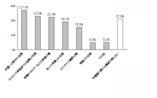 総括 : 中国語を耳にする場面では、「接する場面は特に無い」と回答したのがわずか7.9%であった。「中国への旅行や出張」「授業やセミナーなど学習の場」はさることながら、「友人や同僚との会話」が34.0%、「コンビニや飲食店での店員の会話」が22.932.5%、「友人や同僚との会話」が19.1%となり、日本にいながら中国語に接する機会が多いことを伺わせるような結果となった。また、「中国語に接する場面は特に無い」と回答したのは21.0%であり、5人に4人は何らかの場面で中国語に接する機会があることもわかった。