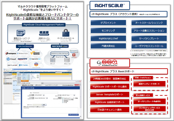 ブロードバンドタワーは、RightScale社がSaaS形式で提供するクラウドの管理運用ツール「RightScale」を提供する「c9 RightScaleプラス」、更に「c9 RightScaleプラス Basicサポート」にてクラウドの「運用負荷軽減」「運用サポート」のニーズに対して応えます。