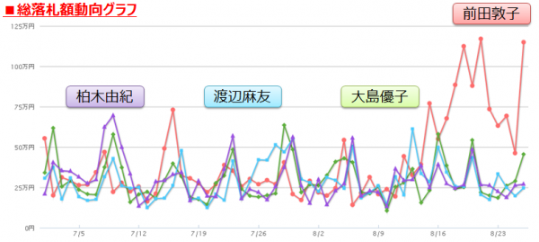 「前田敦子」関連商品が伸びを見せ始め、卒業公演前日(8月26日)の総落札額は1,149,300円にまで達しました。