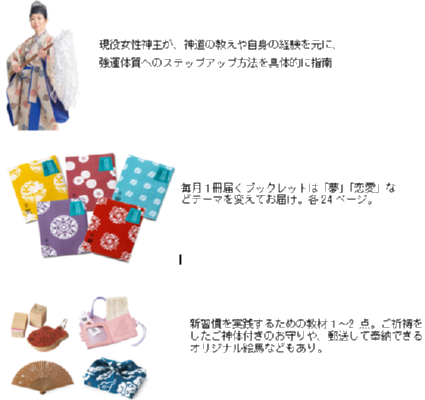 この商品は、尼崎えびす神社の女性神主・太田垣亘世さんによる、強運体質になるための心得と新習慣のすすめをまとめた12冊のブックレットに、新習慣を実践するための12種類の教材をセットした、新しいレッスン型通販です。毎月1セットずつ、合計12回お届けします。伝統文化である神道についてわかりやすく学び、日常の習慣も見直していくことで、1年後には強運体質のしあわせ小町に変身できます。