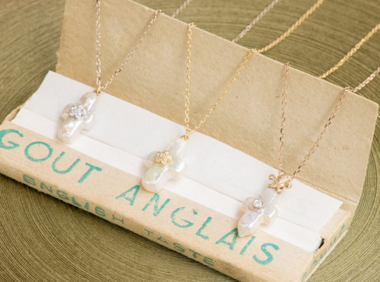 クロスの形をした淡水パールネックレス。淡水真珠独特の風合いを 楽しみながら、カジュアルにお使いいただけるデザインです。
