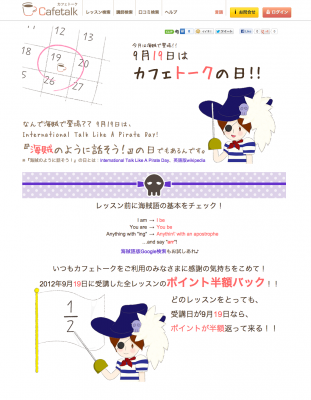 9月19日はアメリカで話題になった、『海賊口調記念日(International Talk Like A Pirate Day)』でもあります。ネイティブ講師とのレッスンで、「海賊語」を使ってみたり、トークのネタにしてみては、いかがでしょうか?