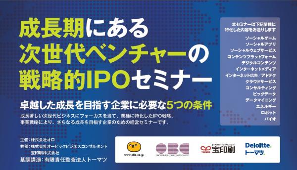 本セミナーは、ソーシャル、ゲーム・アプリ、コンテンツ、クラウドなど、成長期にある次世代ビジネスに焦点をあてた初のIPO(新規株式公開)セミナーです。業種の特性を踏まえた事業戦略、IPO戦略などについて、有限責任監査法人トーマツによる基調講演の他、株式会社オービックビジネスコンサルタント、宝印刷株式会社、オロによる講演を行います。