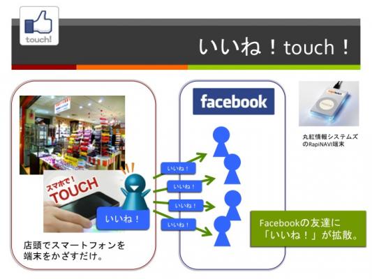 「いいね!touch!」は、丸紅情報システムズのスマートフォン向けFeliCaリーダー、RapiNAVI Light SD (*2)を利用し、店舗やイベント会場に来た客が専用端末にスマートフォンをかざすことで、スマートフォンの画面上に企業のFacebookページを表示し、その場で即座に「いいね!」を押すことができる。