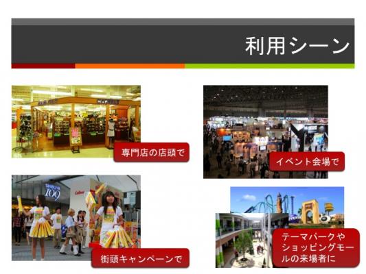 コロタウンドットコムでは、「いいね!touch!」を通じて、店舗やイベント会場以外にも、遊園地やショッピングモール、また街頭でのサンプリングキャンペーンなどの様々な場面で、来客者がリアルタイムに「いいね!」を押せることで、Facebookページヘのファン登録の機会を逃すことなく、その後の様々なプロモーションにつないでいくことを狙っている。