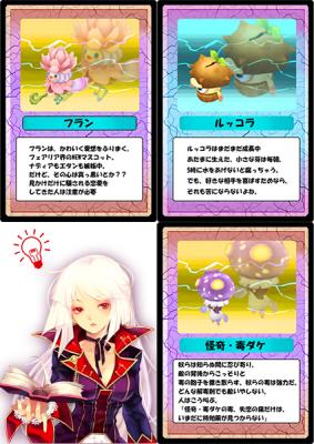 『フラン』は花の妖精である可愛いフェアリア。皆様の冒険にその名のごとく花を添えてくれるでしょう。『ルッコラ』は、植物系のフェアリア。まだまだ成長中の可愛い芽が愛らしさ抜群です。そして最後は『怪奇・毒ダケ』いかにも凶悪な毒を撒き散らしそうな姿は、他のプレイヤーを恐怖にたたき落とすかもしれません。