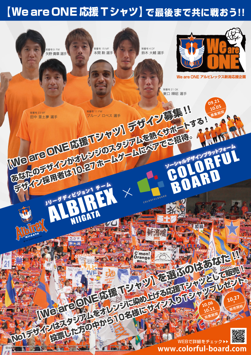 商品開発にあたっては、ソーシャル・デザインプラットフォーム「COLORFUL BOARD」上で、一般クリエイターから広くデザインを募集、サポーターのスコアリング(投票)によって受賞デザインを決定します。受賞したデザインはTシャツとして製品化され、アルビレックス新潟のホームゲームにて販売されます。