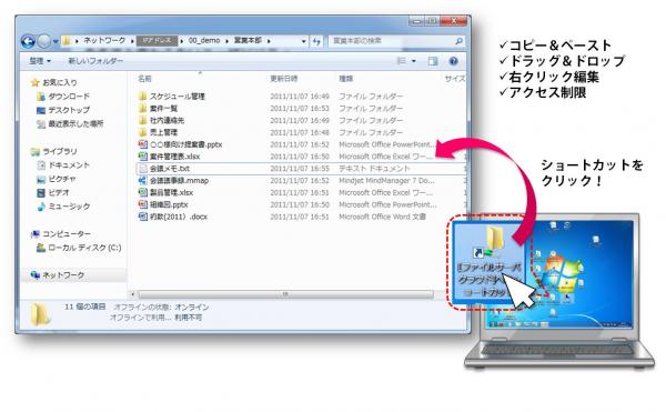 操作性は社内にあるファイルサーバと同様(Windowsエクスプローラー)で、マニュアルや教育などは一切必要としないユーザビリティを実現しています。