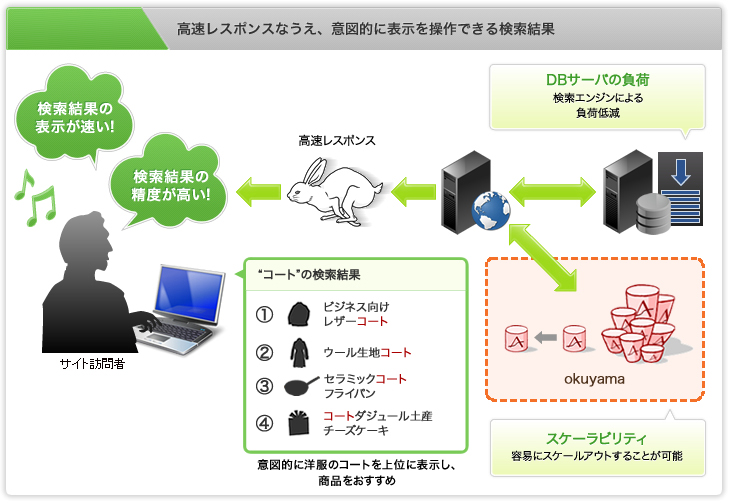実際に「NOSQLデータベースokuyama」を導入いただいた企業が抱える「繁忙期は通常の数倍アクセスがあり、レスポンスに不安がある」「キーワード検索で売りたい商品を上位表示させたい」「検索機能がサイトパフォーマンスのボトルネックとなり、肝心の購買機能に支障が出てしまう」などの課題を解決するために開発した検索エンジンです。