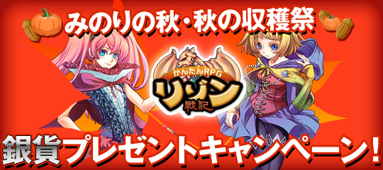 ホリゾンリンク株式会社(本社:東京都品川区、代表取締役社長:田中 進)は、かんたんに遊べることに特化した無料オンラインRPG「リゾン戦記」において、「みのりの秋・秋の収穫祭」銀貨プレゼントキャンペーンを開催いたします。