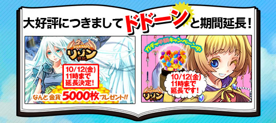 2012年10月12日(金)11時まで、ガチャ1回に必要な【リゾン】をノーマルガチャでは200リゾン→100リゾンへ、エリートガチャは600リゾン→300リゾンとなる半額キャンペーンを実施しております。ぜひこの機会にガチャをお安くお試しください。