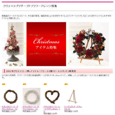 アミファはプリザーブドフラワー花材のショッピングサイトであると共に、花文化に関連した情報ページを多く掲載しているサイトである。クリスマスは母の日に次いで、プリザーブドフラワーの需要が高まるシーズンイベントである。従来、クリスマスデコレーションは安価な造花がメインであったが、ワンランク上のデコレーションを求めるニーズに対応した、プリザーブドフラワーがシェアを伸ばしている。売れ筋価格帯は完成品のリースで、5,000~10,000円と造花の数倍だが、デザイン性の高さから20~40代の女性を中心に支持されている。