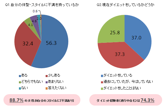 ■「ダイエットをしている」と答えた女性は37.0%、「過去にしていたが今はしていない」という女性は37.3%%で、