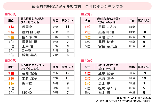年代によってランキングに変化が見られ、第3位の「香里奈」は、10代の中ではトップとなっている。