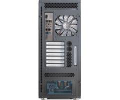 本体前面に2台の14cm静音ファンが、天板にはエアシュラウドにより背面に排気される1台の18cm静音ファンが装備されており、側面にも14cmファンの追加が可能です。さらに空冷モデルのの背面には、内部温度に応じて変速する14cmのPWM(Pulse Width Modulation)ファンが装備されており、水冷モデルではラジエーターと冷却用12cm PWMファンを装備しています。CPUソケットに固定された2台の冷媒用DCポンプには、低振動・低動作音のPWMモーターを採用しています。2台のポンプはタンデムに連結され、万一1台のポンプが停止しても70%以上の冷媒流量が確保できます(3)。