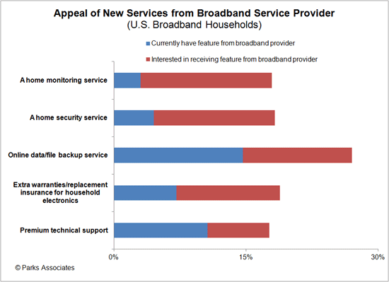 米国調査会社パークスアソシエイツ社は、米国のブロードバンド世帯の14%が、インターネットサービスプロバイダの提供するセキュリティサービスに高い関心を持っていると報告している。また、米国のプロフェッショナルモニタリングを利用している16%の消費者も、インターネット利用可能なシステムを使った新しいバンドリングサービスやサービスに関心があるとのことである。現在契約している監視サービスのプロバイダが、Eメール受信通知、エネルギー管理、照明の自動調整機能などの新しいサービスの提供を行わない限り、プロバイダを切り替えたいとしている消費者は約40%で、バンドリングサービスや新しいIP機能は、顧客のつなぎ止めや加入者数の拡大に非常に大きな重要性を持っていることが明らかである。