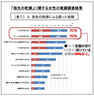乾燥”について意識調査を実施※。 その結果、「ビニール袋・レジ袋類が開けにくい」など、困った体験があると回答した人は90%以上。ほとんどの女性が日常的に不便さを感じていることが分かりました。