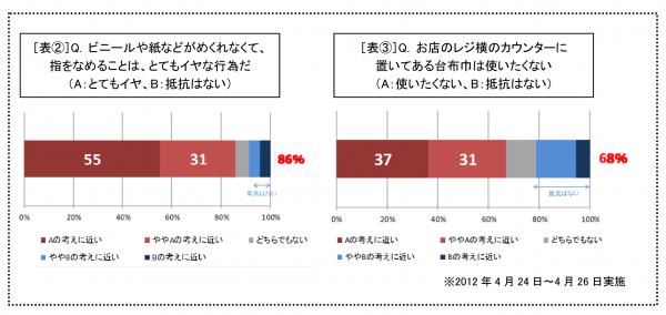 さらにその対策として“指をなめてめくる行為”について聞いたところ、「指をなめることはとてもイヤ」と回答した人はなんと86%。「お店のレジ横のカウンターに置いてある台布巾を使いたくない」という人も68%と多く、 ビニールや紙をめくる際の不満と、高い清潔志向がうかがえる結果となりました。