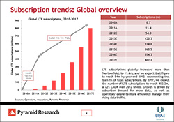 現在、LTE加入者の主流はPC、PCアドオン、タブレットである。しかし、予測期間中、特に北米、欧州、アジアの先進市場では、携帯端末がLTEの大部分を占めるようになるだろうとピラミッドリサーチ社は予測している。2017年には、携帯電話の販売数で、韓国では82%、日本で79%がLTEであるだろう。米国ではLTE携帯電話は携帯電話販売総数の71%であるだろう。