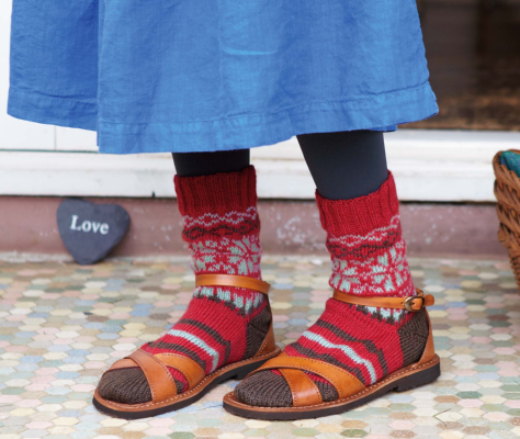 靴下というより「足のセーター」と呼びたいくらい! 毛糸の色はクチュリエオリジナル。こだわった微妙な色を染めるところからしています。柄のバリエーションが豊富なのでさまざまな編み方を体験できるのとコレクションする楽しみがあります。