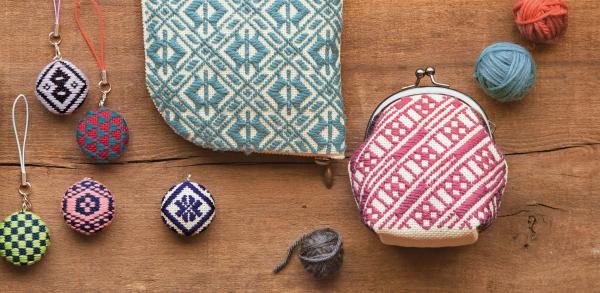 毛糸を使って楽しむこぎん刺しポーチキットです。やや太さのある毛糸を用いることで、模様にふっかりとした立体感が生まれ、通常のこぎん刺しとはまた違った、北欧のテキスタイルのようなかわいさに仕上がります。