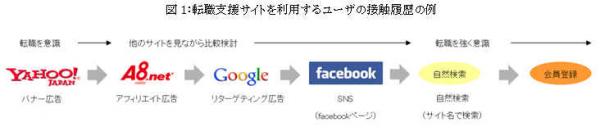 転職ビジネスでは、ユーザはサイトを訪問後すぐに会員登録をするわけではなく、長期間の検討を経た上で行う傾向がある。つまり、最終的に会員登録に至った接触だけではなく、啓蒙や、興味喚起といった事前の接触の役割も含めて、広告の効果を正しく評価することが重要になる。