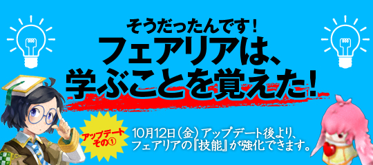 フェアリアたちは『技能』を所持しており、この『技能』を他のフェアリア達と付け替えてカスタマイズする事が出来ましたが『技能』そのものを強化することはできませんでした。しかし10月12日(金)のアップデートに伴いフェアリアの『技能』を強化できるようになりました。これにより一層カスタマイズ、戦略の幅も広がり、相棒?としてさらに頼もしい成長を遂げることができます。