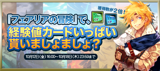 『フェアリアの冒険』は、通常では、なかなか入手することができない特別なアイテムを獲得するためにフェアリア単独で冒険をさせてアイテムを取得する機能です。今回はその『フェアリアの冒険』で獲得できる『経験値カード』獲得数が、なんと!2倍になるお得なイベントを開催致します。