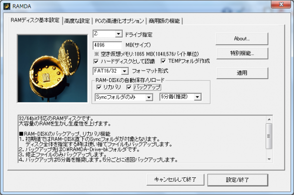 RAM-DISK「RAMDA」Ver1.2は64bitモードにおいて最大32GB,32bitOS管理外モードにおいて16GBのRAM-DISKを作ります。大容量メモリ時代に相応しいRAM-DISKを提供します。RAMDAはインテリジェント型自動バックアップ機能搭載、拡張ショートカット(ジャンクション)を備えます。擬似不揮発化を提供し、ハードディスク同様の操作性を提供します。