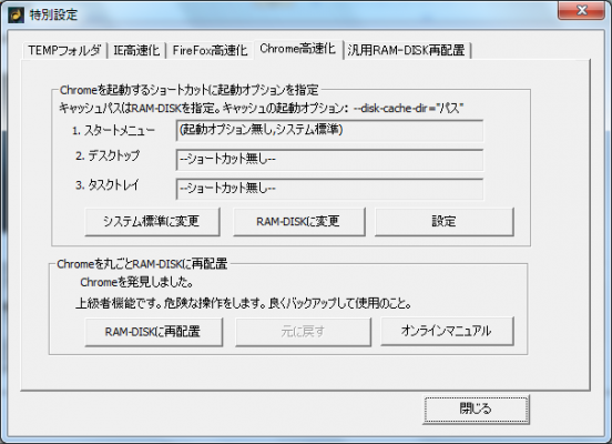 また既存インストールしているFire Fox, Google ChromeをRAM-DISKにワンタッチ再配置する機能を装備します。