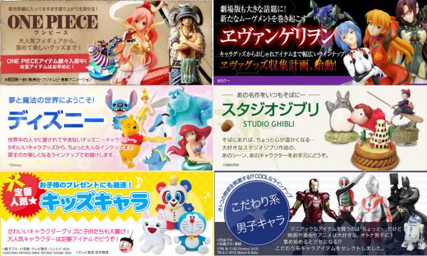 「ONE PIECE」や「エヴァンゲリヲン」を始めとした、20作品以上のカテゴリ、数百アイテムのキャラクターグッズを取り揃えています。