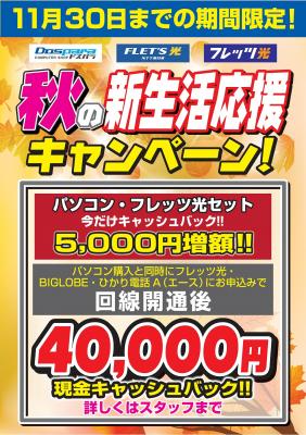 株式会社ドスパラ(取締役社長: 畑谷浩治、本社 : 東京都千代田区)は、全国21店舗の「ドスパラ」店舗において、キャンペーン期間中にパソコン購入と同時に「フレッツ光」と「BIGLOBE」を契約されると、最大4万円がキャッシュバックになる『ドスパラ×フレッツ光 秋の新生活 応援キャンペーン』を実施いたします。