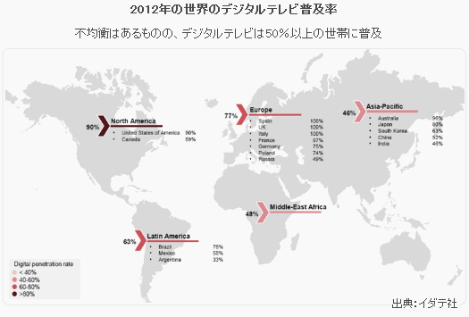 イダテ社によれば、世界のデジタルテレビ世帯数の普及率は、2016年のテレビ世帯数の77.6%である。デジタルテレビの普及においては、以下の3つの特徴がある。