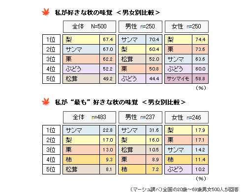 男女別に見ると若干の違いがあり、男性の1位は「サンマ」で、女性の1位は「梨」。