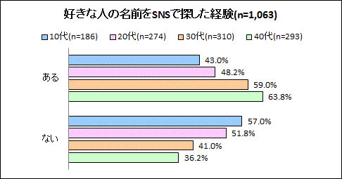 ■「好きな人の名前をSNSで探した経験のある人」最も多いのは40代!(63.8%)