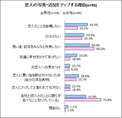 全国16-49歳のSNS経験有り・現在恋人がいる男女1,063人に対して、「SNSと恋愛事情調査」について携帯電話で調査を実施した結果、恋人の写真・近況をSNSにアップしたことがあると答えた人に対して、「恋人の写真・近況をアップする理由」について聞いたところ、最も多く挙げられた理由は「自然と(恋人とのことに限らず色々なことをアップしている)」であった(64.5%)。本項目は理由というよりも「普段から色々と写真・近況をアップしているから、恋人のことも自然とアップする」という、必然的なものを感じる。次いで「思い出・記念をみんなと共有したい」(57.0%)、「のろけたい」(36.6%)、「恋人のことを自慢したい」(32.2%)という理由が挙げられた。各項目を男女で比較すると、「思い出・記念をみんなと共有したい」に関しては女性の方が多い結果となった(男性:50.0%、女性:60.0%)。
