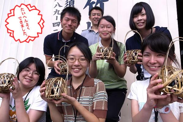 場での製造研修、特産虎竹を使った花籠作りなど現場で体験を、後の1週間でホー