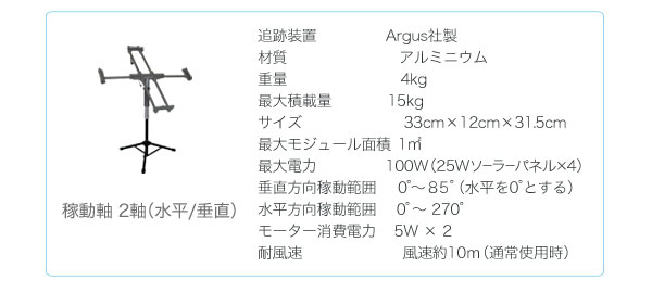 商品は、ソーラーパネル4枚(最大出力100ワット)、光源追尾センサー、水平・垂直方向に動く2軸モーター、架台で構成しています。パネルに光源追尾センサーを装備したことで、日の出から日没まで、パネルの向きがヒマワリのように太陽を追いかけるシステムです。一般的な固定式のソーラーパネルは、最適な発電環境は日中の数時間に限られましたが、このシステムにより従来の約3倍の発電効率が見込めます。