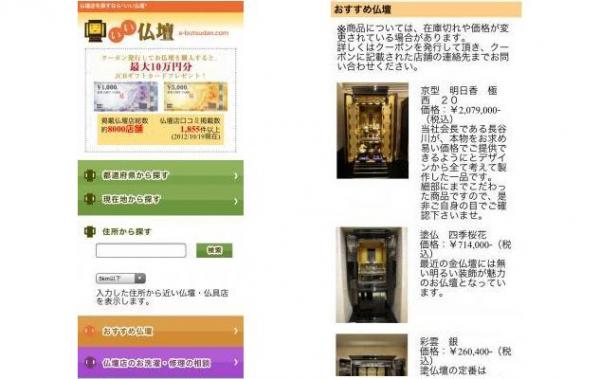 全国8000店舗の仏壇店を掲載。商品情報、お店の紹介記事、実際に購入した方の口コミなどの選択基準を提示。サイトを利用して購入すると、購入金額に応じたギフトカードのプレゼントサービスも行う。2003年12月開設。