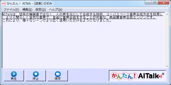 テキストから合成した音声を(1)16bit 16KHz PCM、(2)16bit 8KHz PCM、(3)μ-lawの3種類の形式から自由に選択してファイルに保存することができます。