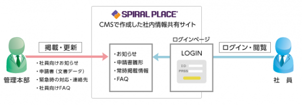 例えば社内サイトを構築する場合、グループウェア内での共有だけでなくFAQなどの多彩なコンテンツを社員向けに限定公開できます。社員はグループウェアと同一のID・パスワードで社内サイトにログインし、各部署からの全社員向けのお知らせや、管理本部からの申請書ファイルへの直接リンク、新入社員向けFAQ設置など、社内全般に通達する情報を容易に発信し共有できます。