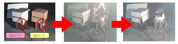 箱の下から角にバーナーで約10分間、火を当てたところ、防炎タイプは穴が開いたものの炭化して燃え広がらず、中身の書類も無事だった。当社従来タイプは段ボールは燃え尽き、中身の書類にも延焼が見られた。