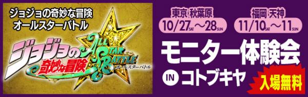 コトブキヤショップ「コトブキヤ秋葉原館」(東京都千代田区外神田1-8-8)とコトブキヤ福岡天神(福岡県福岡市中央区天神2-11-2 ソラリアステージ5F)にて、東京ゲームショーでも話題となりましたPS3用ソフト「ジョジョの奇妙な冒険 オールスターバトル」のモニター体験会を開催いたします。東京:2012年10月27日(土)・28日(日)、福岡:11月10日(土)・11日(日)、にて開催予定。入場無料のイベントとなっておりますので、この機会にぜひご参加ください。
