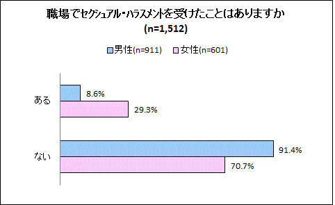 図表参照:職場でセクシャル・ハラスメントを受けたことはありますか(男女別、n=1,512)