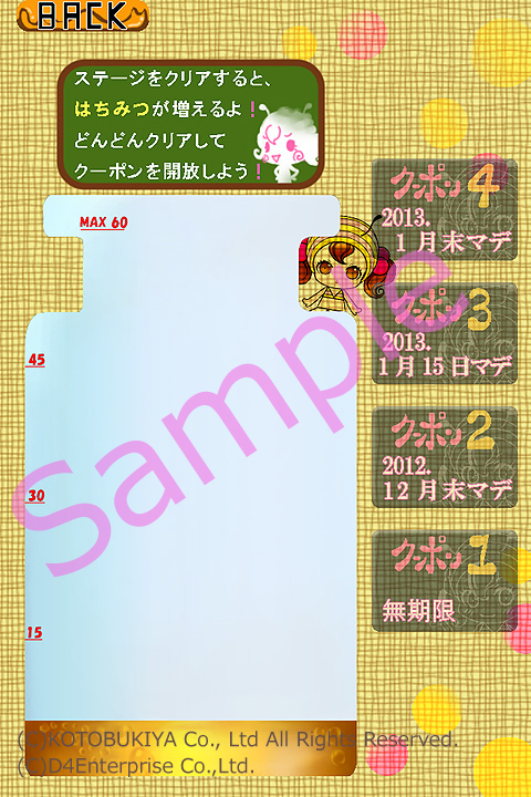 ステージを解いていくと、はちこのはちみつ瓶にどんどんはちみつが溜まっていきます。そして一定量たまると、ごほうびとしてコトブキヤ店舗で使える特製クーポンが手に入ります!どんどん解いて、おトクなクーポンをゲットしよう!