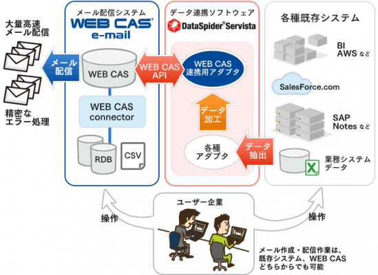 この度、エイジアとアプレッソは上記の課題を解決し、ユーザー企業の多種多様なシステム連携ニーズにお応えしていくため、両社共同によるWEB CASとDataSpiderの接続検証を行い、連携の動作確認を完了しました。これにより、WEB CASのメール配信機能と、容易に接続できるシステムの種類がさらに拡張されることになりました。