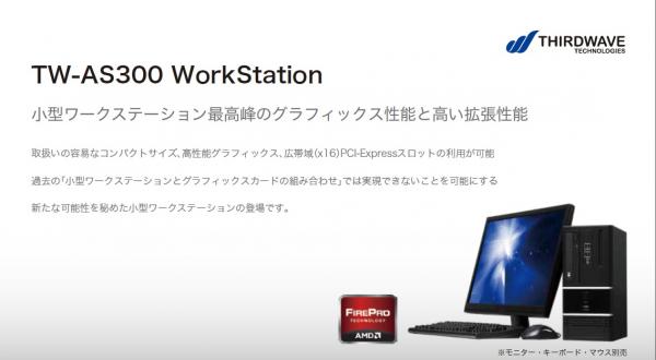 株式会社サードウェーブテクノロジーズ(取締役社長:野本 卓、本社:東京 都千代田区)は、2012年10月30日(火)より、AMD製 FirePro(TM) APUを採用するワークステーション「TW-AS300」シリーズ2製品を発表。本日より受注を開始いたしました。